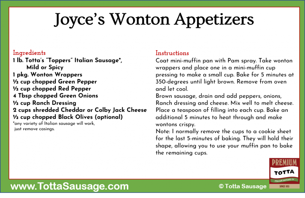 1 lb. Totta’s “Toppers” Italian Sausage (mild or spicy)